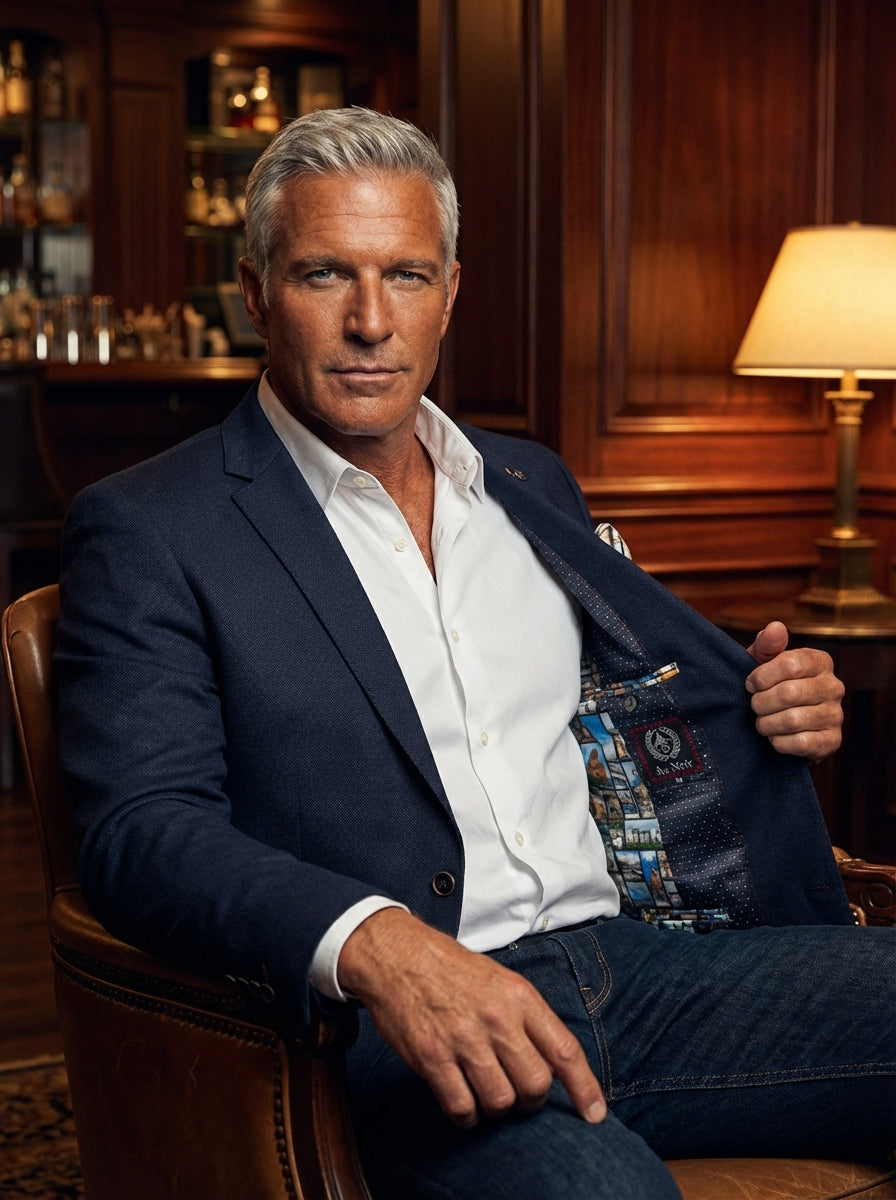 This tailored navy blazer features a textured weave and a luxurious designer lining with unique graphic prints. Styled with a crisp white button-down shirt and denim, it offers a sophisticated yet modern look perfect for smart-casual events and upscale evenings.