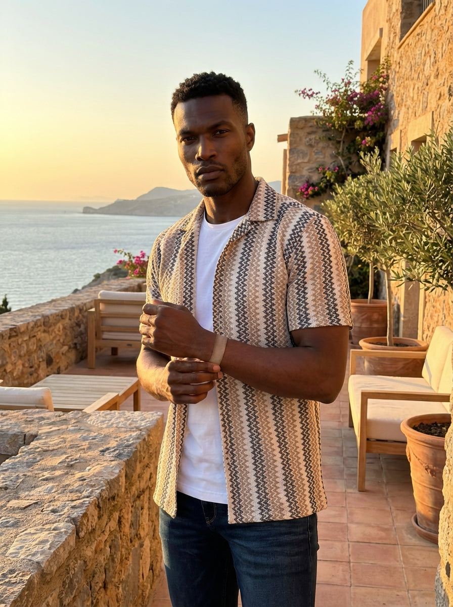 This men's short-sleeve button-down features a contemporary zigzag knit pattern in sophisticated tan, cream, and charcoal tones. Designed with a stylish camp collar, this textured open-front shirt offers a versatile layering piece perfect for casual summer outings or elevated evening wear.