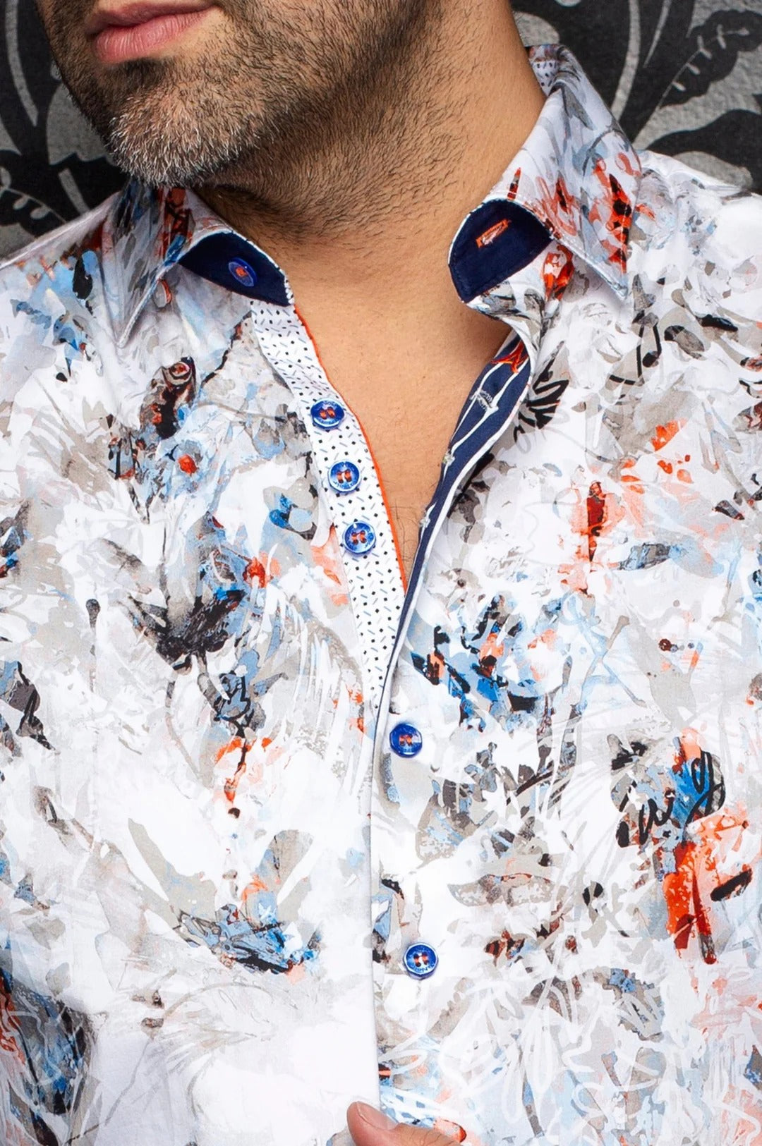 This men's long-sleeve button-down features a vibrant, multi-colored abstract floral print on a white base. It boasts intricate contrast detailing on the inner collar and cuffs, including navy stripes and micro-dots, paired with blue buttons for a sophisticated, modern finish.