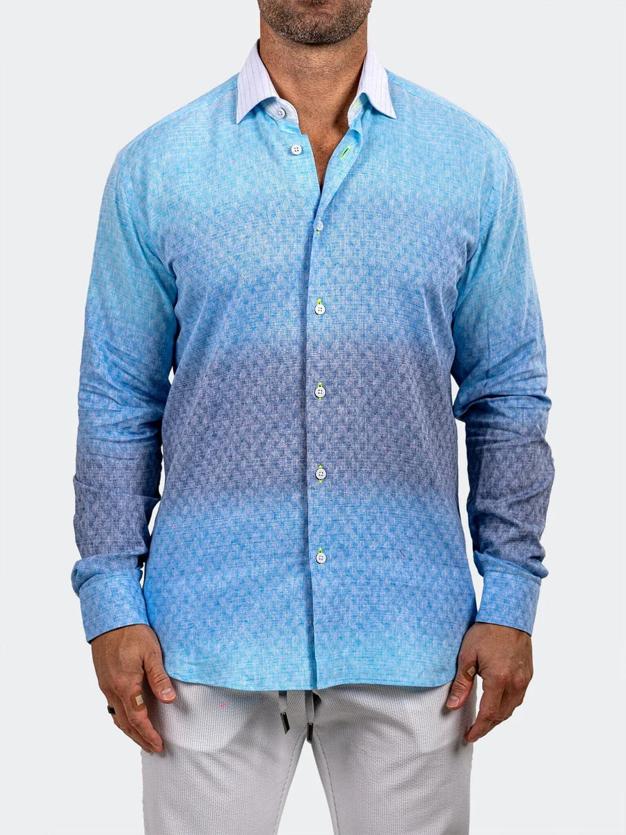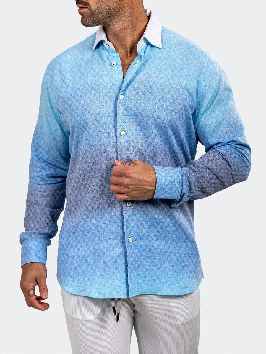 This premium long-sleeved button-down shirt features a sophisticated blue-to-navy ombre gradient with an intricate micro-pattern texture throughout. Its contrasting white pointed collar and refined linen-blend fabric offer a breathable, elevated look perfect for transitioning from day to evening wear.