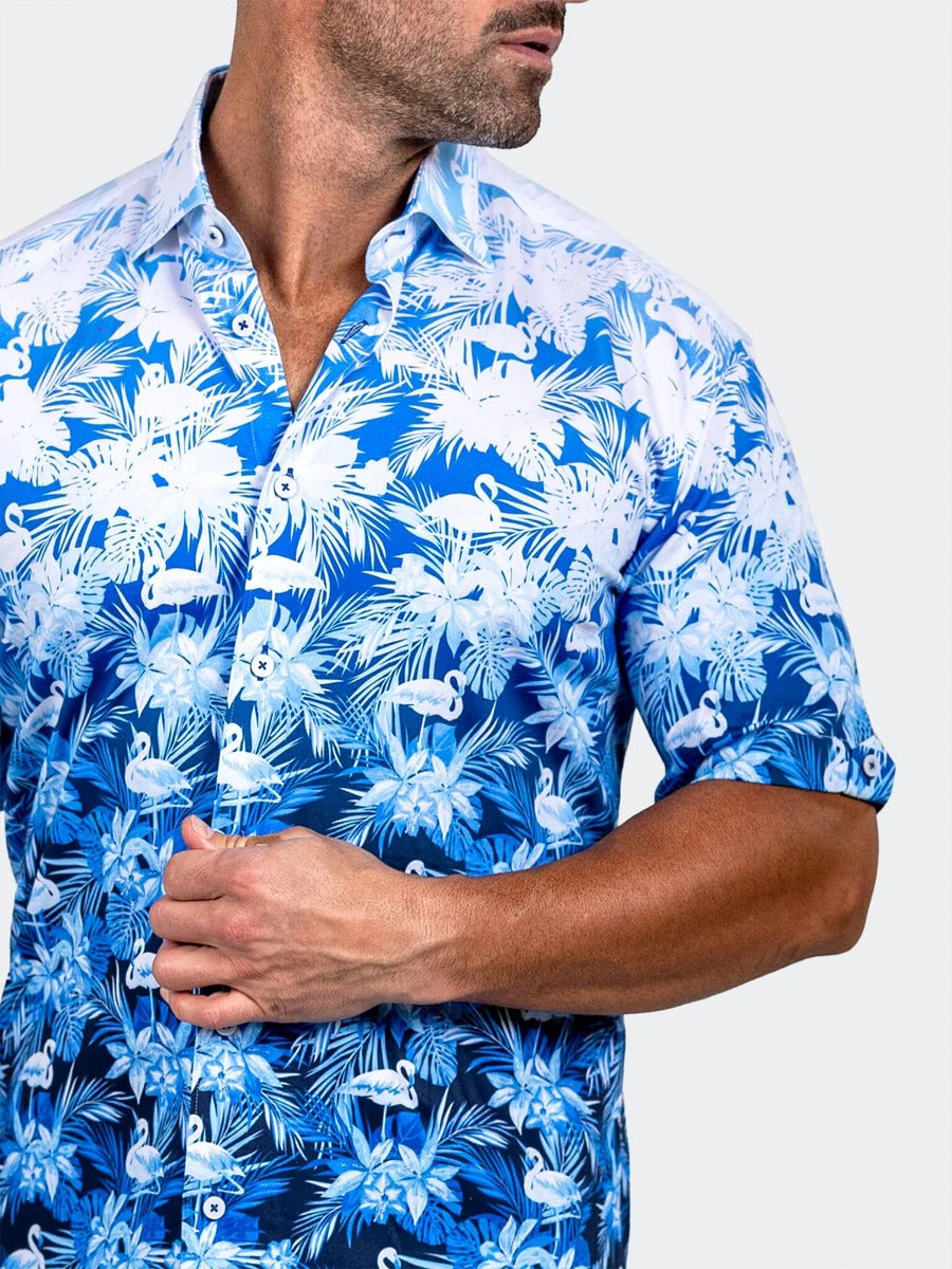 This men's short-sleeve button-down shirt features a vibrant tropical print with flamingos and palm leaves. The design utilizes a striking blue-to-white vertical ombre effect. Crafted from lightweight fabric, it offers a regular fit with a classic pointed collar.