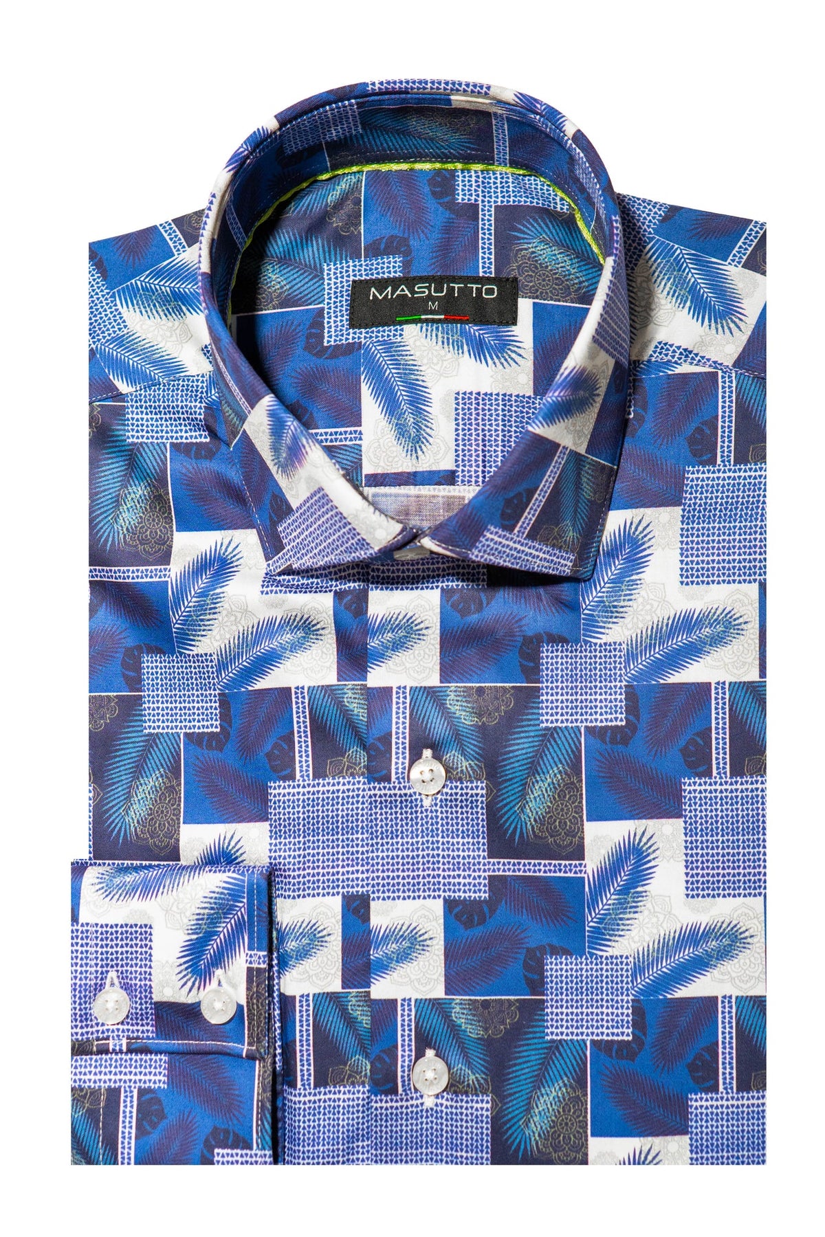This Masutto men's button-down shirt features a vibrant blue and white patchwork design. The intricate pattern blends tropical palm fronds with geometric tiled motifs and subtle mandala accents. Crafted with a crisp collar and long sleeves, it offers modern resort elegance.