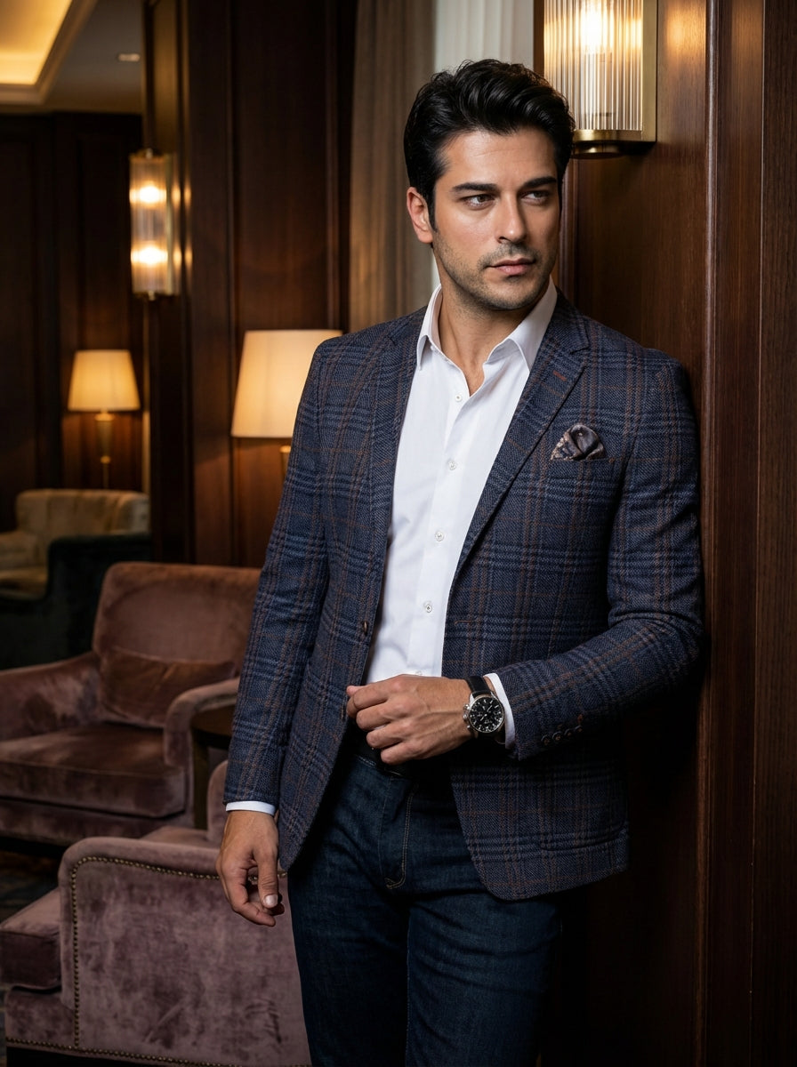 This sophisticated ensemble features a navy and rust plaid blazer with a tailored fit, paired with a crisp white button-down shirt. The look is grounded by dark denim jeans and accessorized with a classic leather watch and pattern pocket square.